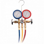 Манометрический коллектор для хладагента R-12. К штуцерам подключаются шланги для заправки хладагента или проверки давления, а вентили обеспечивают герметичность контуров и простую регулировку подачи хладагента.