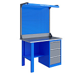 Однотумбовый. Допустимая нагрузка на столешницу 750 кг. Опорные элементы выполнены сварными из холоднокатаной стали. Верстак состоит из столешницы, опоры, тумбы P3 с тремя большими ящикам, полки-стенки, двойного экрана с кронштейнами и комплекта освещения. Все металлические элементы покрыты полиэфирной порошковой краской. Столешница состоит из фанеры марки ФСФ толщиной 24 мм, которая покрыта лаком-антисептиком и листом оцинкованной холоднокатаной стали толщиной 1,2 мм. Размеры (ВхШхГ) 1965x1196x696 мм.