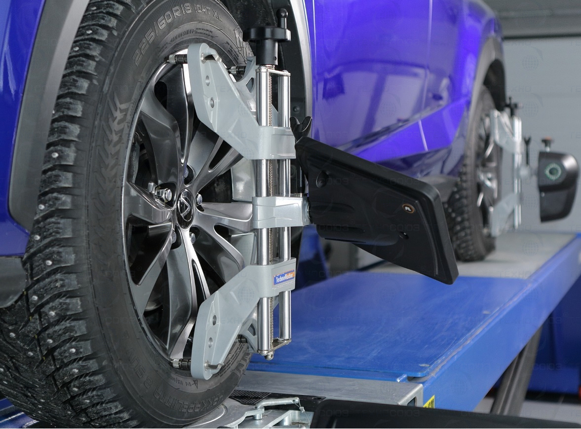 Стойки с установленными в них референсными мишенями монтируются на расстоянии ~700 мм от передней оси колеса автомобиля.