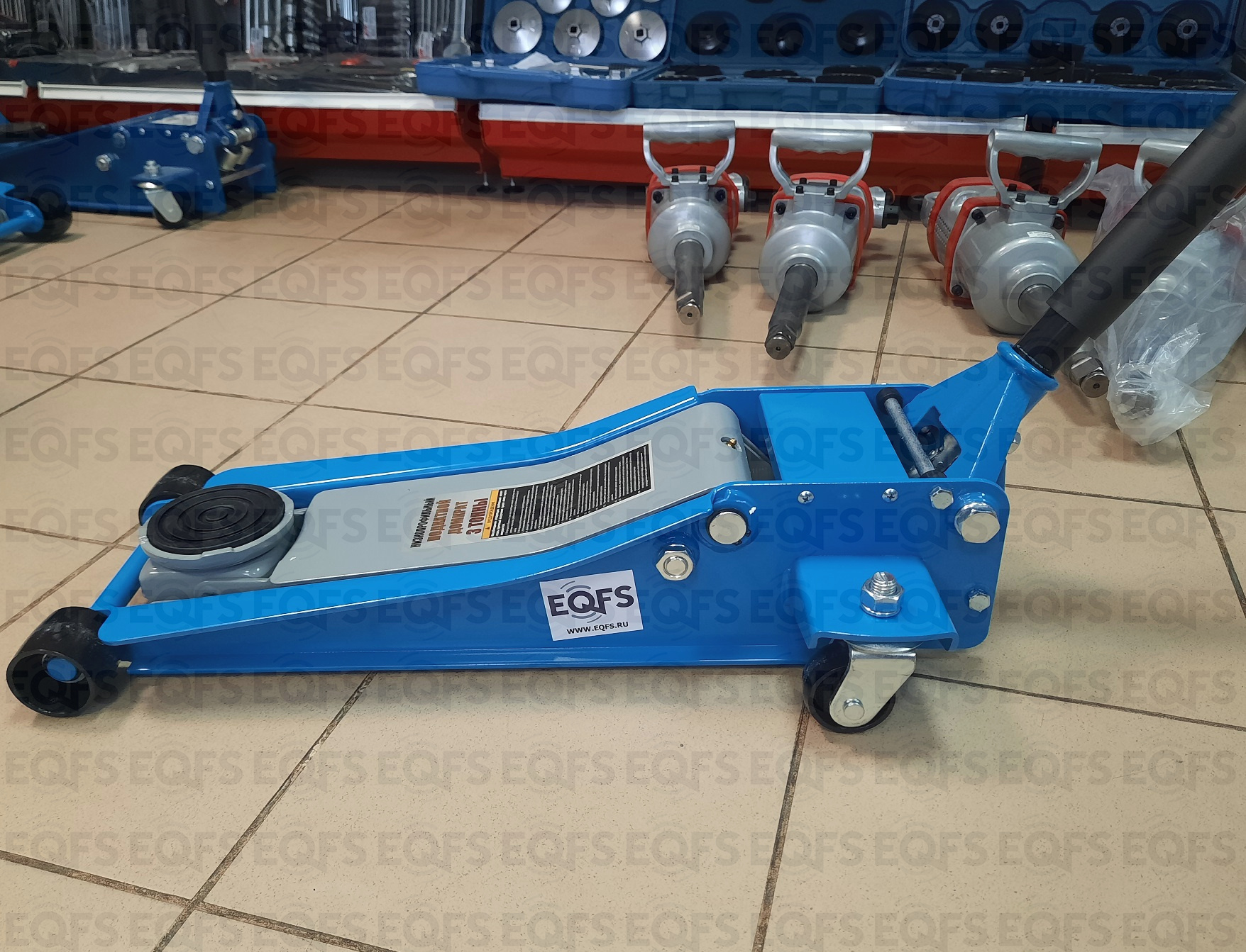 Для профессионалов. Низкопрофильный. Подкатной. Двухштоковый механизм с усиленной конструкцией. Быстрый подъем. С тавотницей. Для применения в шиномонтажных мастерских и автосервисах для поднятия автомобилей с низким клиренсом.  г/п 3 тонны. Высота подъема мин / макс - 75-505 мм. Масса 34 кг.