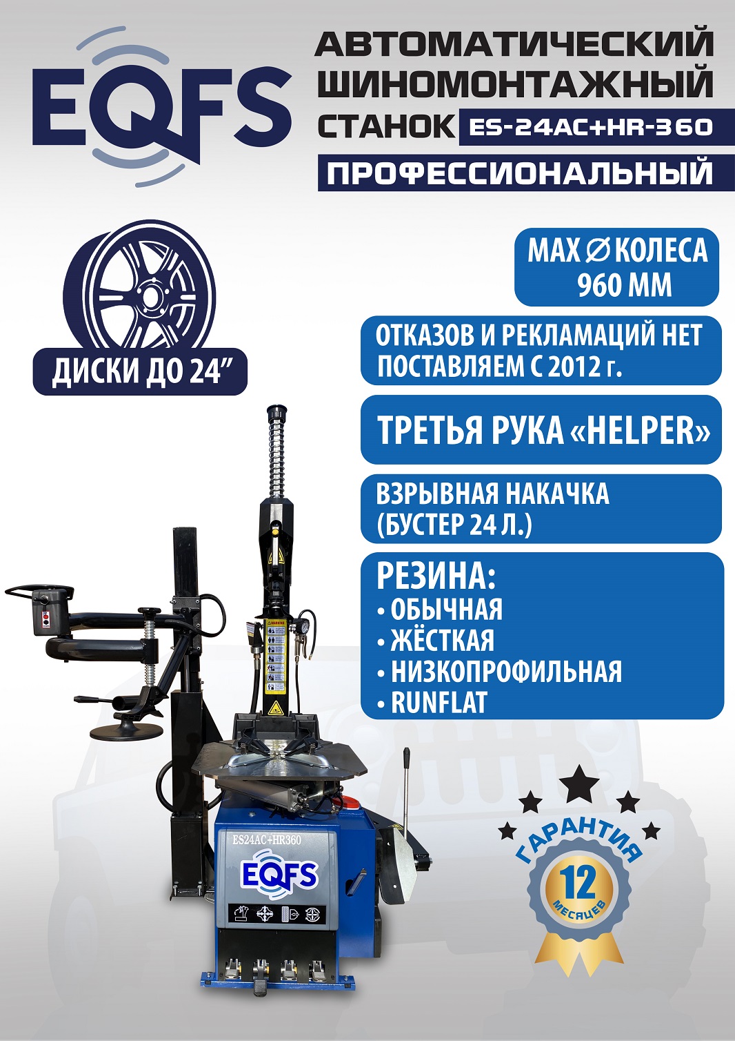 ES24AC+HR-360 Шиномонтажный станок. Автомат. Большой квадратный стол. Для колес с размером от 10-24 дюйма. Усилие отжима увеличено до 2700кг. В комплекте взрывная подкачка + третья рука для работы с низкопрофильными шинами и RanFlat + встроенный бустер 24 литра (взрывная подкачка) + пистолет для подкачки шин + монтажка + регулятор давления с влагоотделителем и манометром.