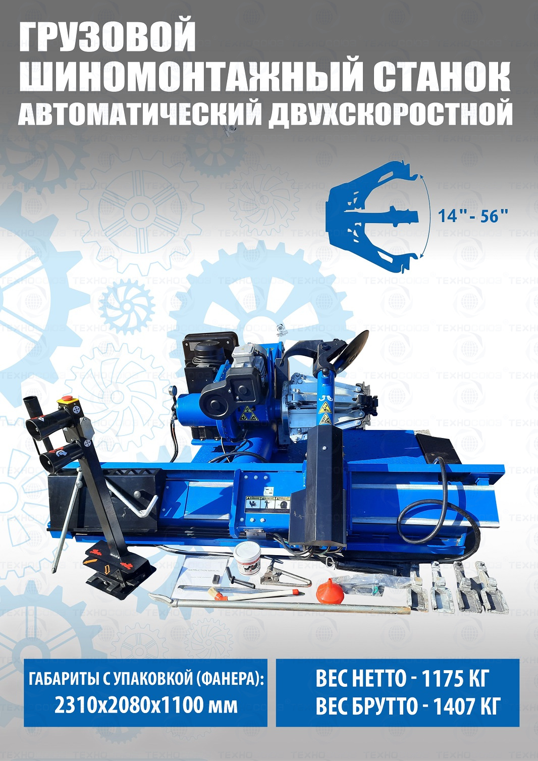 Двухскоростной автоматический грузовой шиномонтажный станок TS-56D для шиномонтажных работ с колёсами автобусов, тракторов, строительной техники с диском 14-56”. Диски ALU, сталь, с кольцом и без 14-56”. Размер покрышки 2500х1200мм, масса до 2000кг. Двухскоростной. Моторы 4 + 4 кВт. Гидравлический насос – Германия «BUCHER HIDRAULICS». Гарантия до 18 мес.