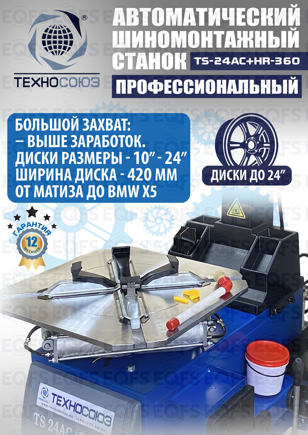 Автоматического шиномонтажного стенда TS-24AC+HR-360. В комплекте взрывная подкачка + третья рука для работы с низкопрофильными шинами и RanFlat! Для колес легковых автомобилей, легких грузовиков, микроавтобусов и коммерческой техники. Для дисков: внешний 10÷21”, внутренний 12÷24”. Напряжение 220/380В. Гарантия 18 мес. – наш монтаж, 12 мес. – самостоятельная установка.