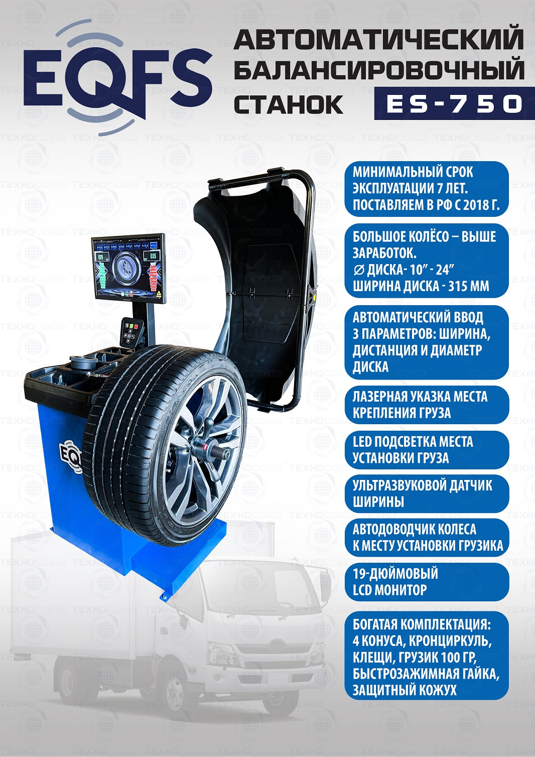 ES-750 Автоматический балансировочный станок. Автодоводчик и лазерная указка места установки грузика. Автоматический ввод 3-х параметров. Для колёс шириной 315мм, Ø до 800мм и весом до 65кг. Диски ширина 3–10” (76-254 мм) , диаметр 10–24” (254÷609 мм)   Программы: статическая и динамическая балансировка, ALU, OPT, SPLIT, калибровка и самодиагностика. LCD монитор 19 дюймов. Вал Ø - 40мм. Для балансировки колёс легковых автомобилей, мотоциклов, лёгких грузовиков и широких колёс. Гарантия 18 мес – наш монтаж, 12 мес – самостоятельная установка.