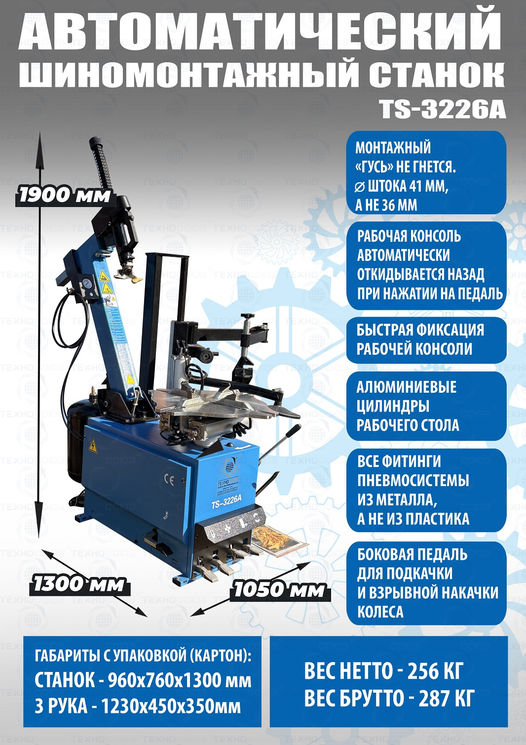 Автоматический шиномонтажный станок TS-3226A Оптимальный вариант цена/функционал. Самый продаваемый автоматический станок! + встроенный увеличенный бустер емкостью 24 литра (взрывная подкачка) + третья рука для работы с низкопрофильными шинами и RanFlat. Для колес легковых автомобилей, легких грузовиков, микроавтобусов и коммерческой техники. Внешний зажим 11-21”. Внутренний зажим 12-24”. Поставляем на 220В и 380В.