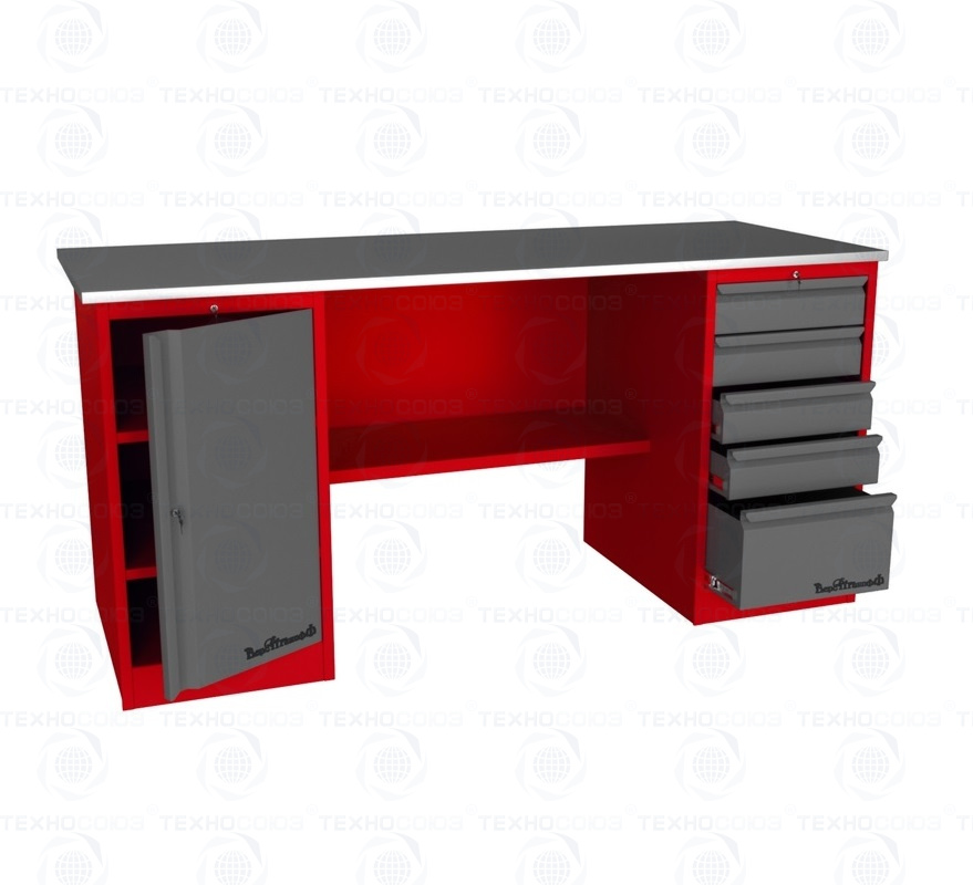Верстак металлический двухтумбовый 1 тумба - 5 ящиков, 1 тумба с ящиками и  дверью, ц. замок, полка, оцинк. столешн. h=24 мм (фанера+оцинкованный металл 1мм). Размеры (ВхШхГ)    870х1800х700 мм. Вес 115 кг. Нагрузка на столешницу 300кг.
