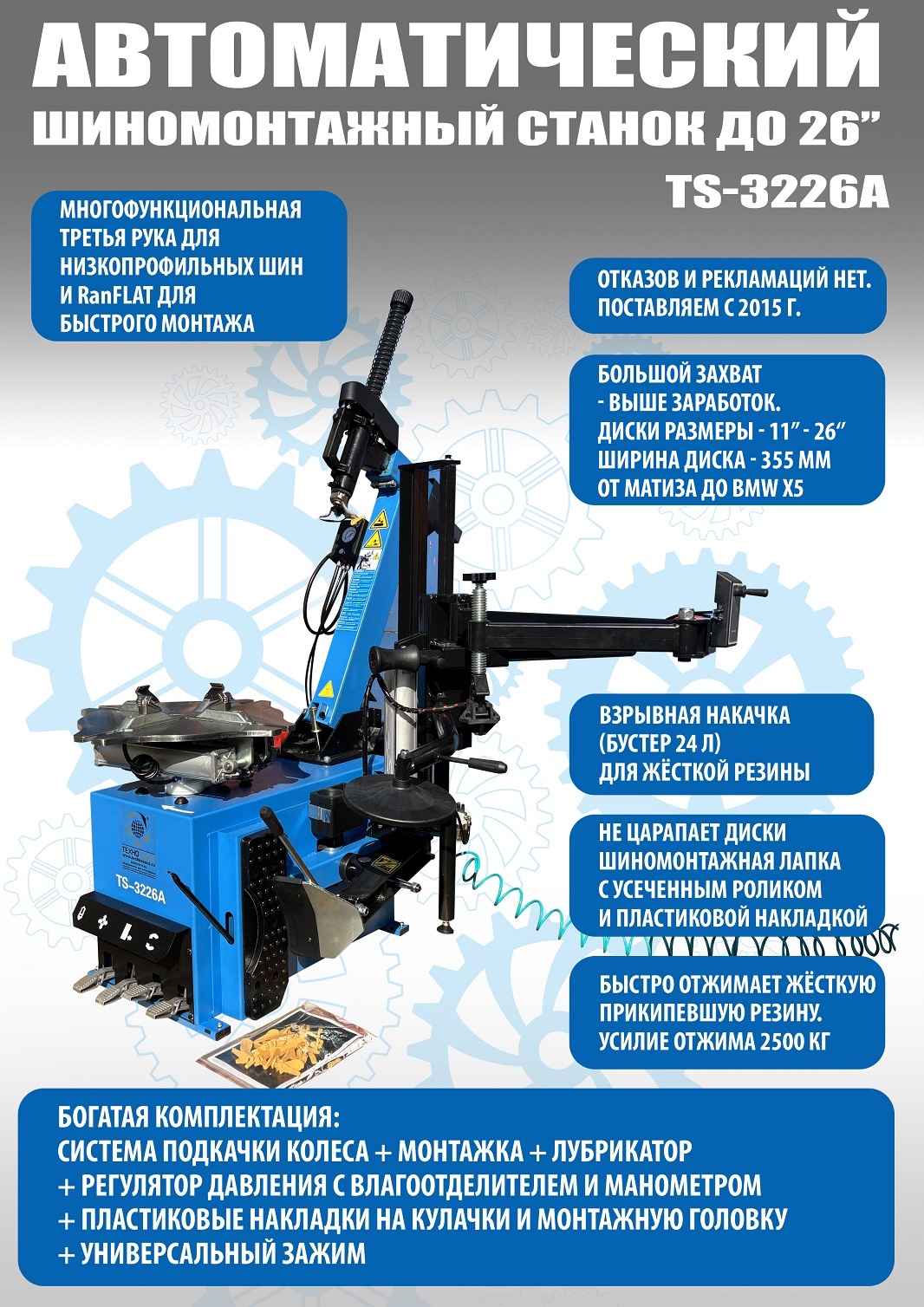 TS-3226A Станок шиномонтажный автоматический до 26". Надёжный автомат - рекомендуем. Для больших и широких колес. В комплекте бустер емкостью 24 литра (взрывная подкачка) + третья рука для работы с низкопрофильными шинами и RanFlat. Размеры дисков: снаружи 12÷24", изнутри 14÷26". Максимальное колесо: Ø 990x355 мм.  220/380В. Масса: 256 кг. Гарантия 12-18 мес